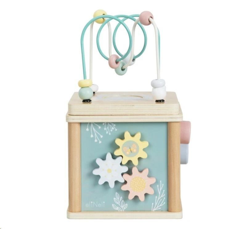 Drevená activity cube (kocka) so zvieratkami si pre deti pripravila veľa aktivít, ktoré potrénujú a zdokonalia detské zručnosti. Aktivítová kocka vyrobená z masívneho dreva, preglejky a MDF ponúka veľké množstvo možností na hranie. Samotné veko (vrchná strana) drevenej kocky predstavuje zábavné bludisko v pastelových farbách, ktoré deťom s ich zatočenými drôtmi a drevenými korálkami trochu zamotá hlavu. Jedna zo strán je vkladačkou, druhá bludiskom, tretia rozkvitnutím lúky s kvetmi vo forme ozubených koliesok a štvrtá zábavnou hrou s otočnými doskami.