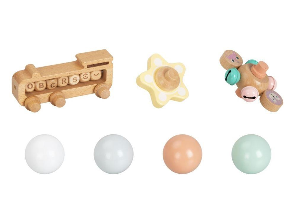 Drevená guľôčková dráha XL vyrobená z tvrdého prírodného dreva, s 6 drevenými zábavnými prvkami a s parádnym vláčikom ZDARMA je zábavnou hračkou pre dievčatká, chlapcov aj celú rodinu. Stačí správne umiestniť jeden z drevených doplnkov (guľôčku, kvietok, koliesko s rolničkami, vláčik) do horného poschodia a sledovať, čo sa bude diať. Hra s guľôčkovou dráhou zdokonaľuje motorické zručnosti, koordináciu očí a rúk, učí deti sústrediť sa a trpezlivosti, niektoré prvky stimulujú zmysly a naučia deti písmenká.