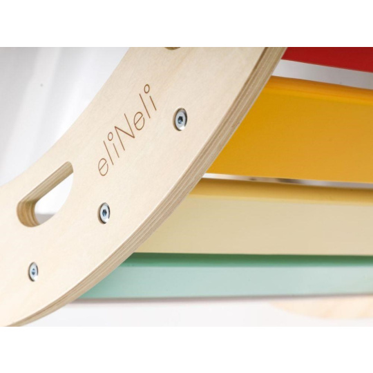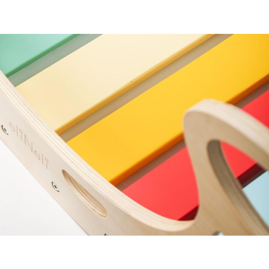 Vylepšená multifunkčná drevená hojdačka 5v1, s doskami v sviežich fresh farbách, je zábavnou hračkou pre deti, ktorú využijú pri pohybových aktivitách aj pri hre. Montessori hojdačka umožní deťom príjemne sa pohupovať, skvele poslúži ako lezenie, skluzavka, skrýša, most, stolička alebo predajný pultík pri hre na obchod. Hojdačka prirodzeným spôsobom rozvíja motorické zručnosti a je vhodná pre deti už od 1 roka.
