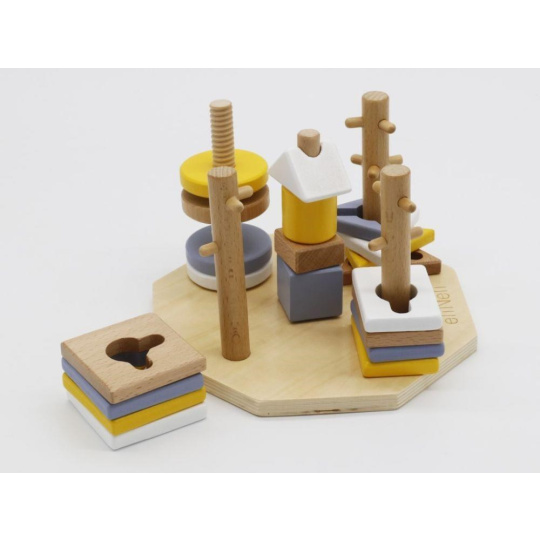 Navlékacie tvary v krásnych neutrálnych farbách deti nasadzujú na drevené kolíky, ktoré však nie sú úplne hladké a deťom navliekanie sťažujú rôznymi výstupkami. Niekedy táto hra vyžaduje veľa trpezlivosti.
