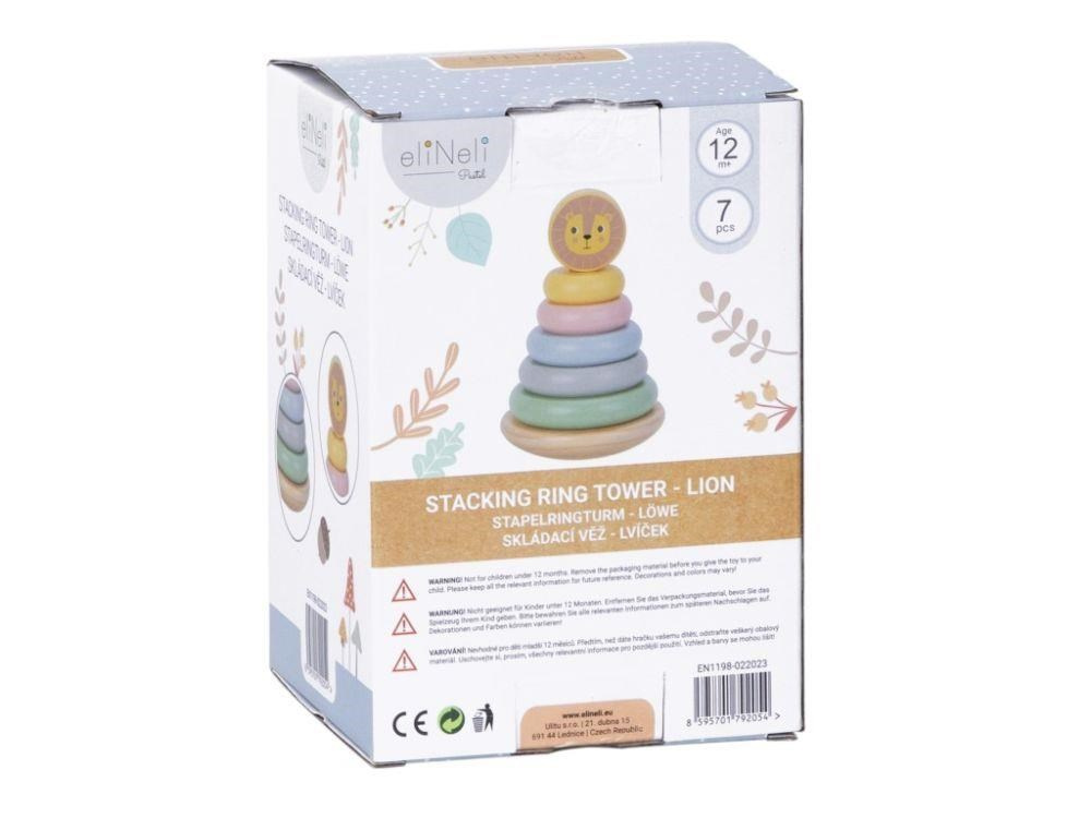 Skládacia veža (pyramída) je obľúbená drevená hračka, ktorá nesmie chýbať v žiadnom detskom kráľovstve. Skládacia veža s kruhmi v jemných pastelových farbách a levíčkom zdokonaľuje jemnú motoriku, koordináciu očí a rúk, logické myslenie, učí deti rozpoznávať rozdiel medzi väčším a menším, sústrediť sa a trpezlivosti.