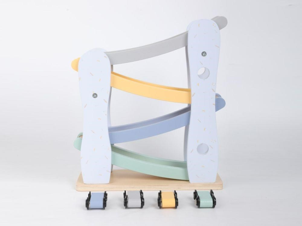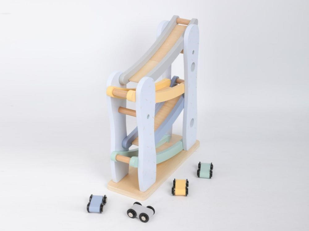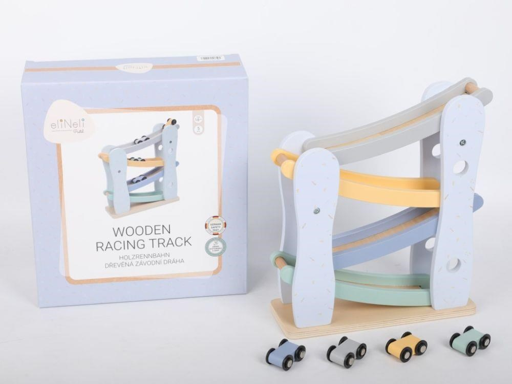 Drevená závodná dráha (autodráha) v krásnych pastelových farbách, so 4 farebnými autíčkami, prebudí dušu pretekára v každom dieťati a pravdepodobne aj v rodičoch. Usporiadanie pretekov s pretekárskymi autami priamo v detskej izbe je zábavnou hrou pre celú rodinu. Rozhodujúce pri tejto hre je správne koordinovanie, presnosť, chvíle sústredenia, jednoducho správne umiestnenie pretekárika na vrchol pretekárskej dráhy.