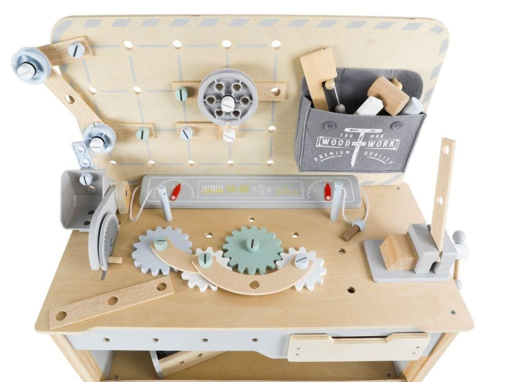 Detský drevený ponk XXL so veľa príslušenstva, skvelým jerábom a opaskom na náradie ZADARMO získa každého malého majstra. Detský ponk v kombinácii sivej farby s farbou prírodného dreva, s jerábom, náradím, skrutkami, doskami a hlavne so skvelým množstvom vychytávok rozvíja jemnú motoriku, manuálnu zručnosť, koordináciu očí a rúk, rozvíja kreativitu, učí deti sústrediť sa a trpezlivosti.
