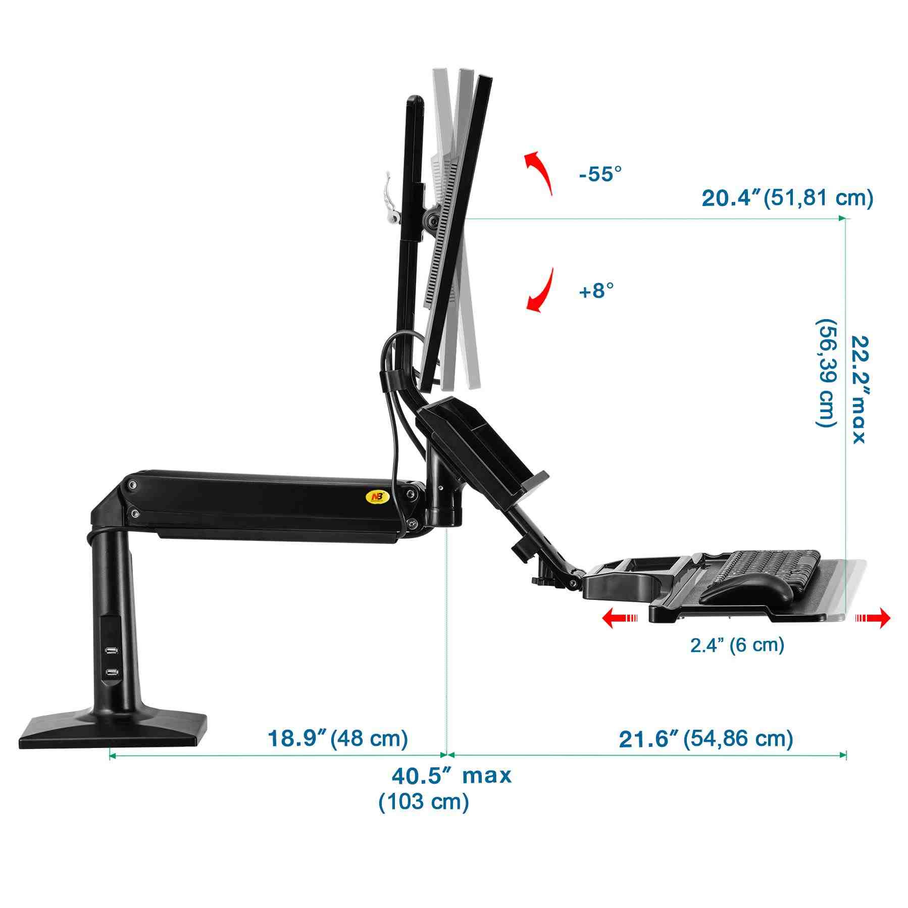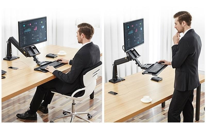 Držiak monitoru a klávesnice NB NB35 Profesionálny stolný držiak na monitor 17-30" s poličkou na klávesnicu 560x200mm, výškovo nastaviteľný +/-480mm, naklápanie +12°/-15°, otáčanie +/-180°, pivot, možnosť vysunutia a zaklopenia police, priehradka, 2x USB 3.0 porty, práca v sede aj v stoji, VESA 75x75 a 100x100, nosnosť 9kg Univerzálny stolný držiak na monitor 17-30" a klávesnicu pre ergonomické kancelárie, ktorý Vám umožní kedykoľvek zmeniť pozíciu pre prácu ako v sede, tak aj v stoji. Zmena polohy je veľmi ľahká a rýchla, bez použitia akýchkoľvek nástrojov alebo zložitých nastavovaní - počas okamihu zmeníte výšku až o 480mm. Na držiak je možné uchytiť všetky typy monitorov s VESA štandardom 75x75 alebo 100x100. Držiak umožňuje ľahké kompletné nastavenie podľa potreby - otáčanie do strán, výškovo nastaviteľnosť, náklon obrazovky, posun a náklon police, vzdialenosť od stolového uchytenia, korekcia roviny. Kvalitný duálny úchyt na zabezpečenie na okraji stolu a perfektná fixácia. Profesionálna kvalita, vynikajúce spracovanie, pekný dizajn a veľmi jednoduché nastavenie. Farebné prevedenie čierne. Profesionálny polohovateľný držiak monitora a klávesnice na prácu v sede aj v stoji NB NB35 Technické údaje: maximálne zaťaženie 9kg minimálne zaťaženie 2kg podporuje VESA štandardy 75x75 a 100x100 možnosť rozšírenia VESA štandardu na 200x100 alebo 200x200 ideálny na monitory a televízory s uhlopriečkou 17-30" otáčanie do strán +/- 180° náklon monitoru -12° / +15° funkcia pivot - možnosť polohy monitora na šírku alebo na výšku maximálna výška 950mm od stolovej dosky maximálna dĺžka od uchytenia 1020mm celkové výškové nastavenie +/- 480mm úprava výšky samotného monitora na držiaku 100mm polica na klávesnicu s rozmermi 560x200mm možnosť vysunutia police +/- 60mm, naklopenie +/- 12°, možnosť úplného zaklopenia uchytenie na okraj stola, duálny úchyt, na dosky o hrúbke 20-90mm 2x USB 3.0 port farebné prevedenie čierne profesionálna kvalita, jednoduchá polohovateľnosť záruka 3 roky Pracovná stanica - polohovateľný držiak na monitor a klávesnicu pre voľbu, či chcete pracovať v sede alebo v stoji NB NB35. Polohovateľný držiak na monitor aj klávesnicu, výškové nastavenie pre možnosť práce v sede alebo v stoji, jednoduché a rýchle polohovanie - Fiber Mounts NB35 Držiak podporuje VESA štandardy: VESA 75x75 VESA 100x100