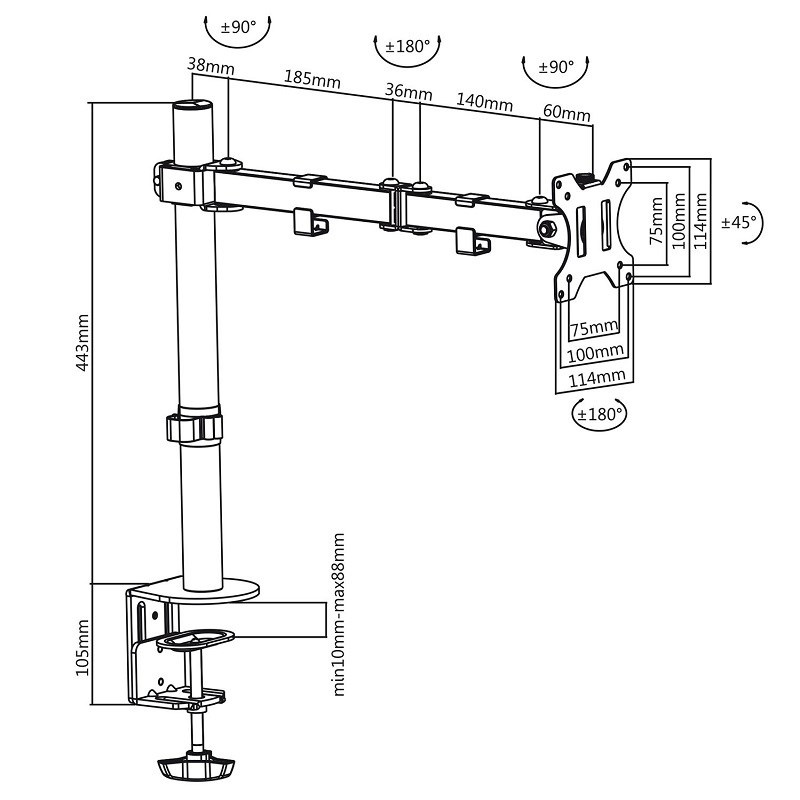 Držiak monitora na stôl Fiber Mounts M7C53 Stolový držiak na monitory 13-32", otočný +/-180°, náklon +/-45°, výškové polohovanie 0-400mm, vedenie kábla, 2 typy stolových uchytov, VESA 75x75 a 100x100, nosnosť 8kg Kvalitný držiak na monitor s uchytením na stolovú dosku - 2 typy uchytení súčasťou balenia. Držiak umožňuje monitor po zavedení výškovo polohovať, otáčať bez obmedzenia do strán, nakláňať. Držiak podporuje VESA štandardy 75x75 a 100x100, nosnosť je 8kg. Farebné prevedenie čierne. Balenie obsahuje inštalačný materiál. Kvalitný polohovateľný stolový držiak na monitor Fiber Mounts M7C53 vám umožní monitor otáčať do strán, nakláňať ho, vysúvať dopredu alebo zasúvať ku uchyteniu, výškovo polohovať. Technické údaje: nosnosť 8kg na monitory s uhlopriečkou 13" až 32" (33cm až 82cm) držiak podporuje VESA štandardy 75x75 a 100x100 maximálna vzdialenosť od nosníka 459mm nastavenie vzdialenosti od nosníka podľa potreby otáčanie do strán podľa potreby +/- 180° nastavenie náklonu +/- 45° súčasťou balenia sú 2 typy uchytení na stolovú dosku úchytky na káble spoľahlivá kvalita farebné prevedenie čierne záručná doba 5 rokov Držiak monitora Fiber Mounts M7C53 podporuje VESA štandardy: VESA 75x75 VESA 100x100