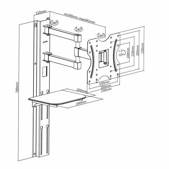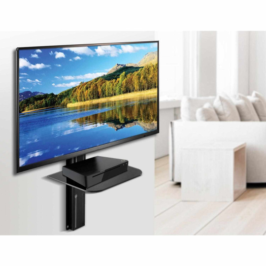 Fiber Mounts SET771 lacná zostava držiaku TV a poličky Držiak na TV 23-50" a polička na príslušenstvo 240x200mm, otáčanie TV až +/- 90°, naklápanie +3° / -10°, vzdialenosť od steny 90-442mm, VESA 100*100 až 200*200, inštalačný materiál, nosnosť poličky 6kg, nosnosť držiaku 30kg Zostava nástenného držiaku na televíziu a poličky. Zostava obsahuje polohovateľný držiak na upevnenie LCD LED televízie 23-50 palcov, ktorý umožňuje otáčanie televízie do strán, jej naklonenie a nastavenie potrebnej vzdialenosti od steny, sklenenú poličku na akékoľvek príslušenstvo a závesnú lištu. Poličku môžete výškovo polohovať. Celková nosnosť zostavy Fiber Mounts SET771 je 30kg. Polička je z tvrdeného skla o rozmeroch 24x20cm a nosnosti 6kg. Všetku kabeláž je možné zakryť do závesnej lišty. Lacná zostava polohovateľného držiaku na TV 23-42 palcov, polica na príslušenstvo a závesné lišty so systémom vedenia a uschovania kabeláže - Fiber Mounts SET771 Technické údaje: maximálna celková záťaž 30kg nosnosť poličky 6kg držiak podporuje VESA štandardy 100x100 až 200x200 univerzálny, vhodný na všetky typy a značky televízorov odporúčaná uhlopriečka TV 23-50 palcov držiak umožňuje otáčanie TV do strán +/- 90° držiak umožňuje naklonenie obrazovky +3° až -10° držiak umožňuje nastavenie vzdialenosti TV od steny v rozmedzí 90 až 442mm polička z tvrdeného skla 6mm rozmery poličky 240x200mm výškové polohovanie poličky materiál oceľ a tvrdené sklo dĺžka závesnej lišty 700mm možnosť zakryť všetku kabeláž do závesnej lišty balenie obsahuje sadu inštalačného materiálu farebné prevedenie čierne záruka 2 roky Držiak podporuje VESA štandardy: VESA 100x100 VESA 200x100 a 100x200 VESA 200x200 držiak nepodporuje VESA 75x75 Na držiak je možné zavesiť všetky typy a značky televízorov, ktorých hmotnosť nepresahuje 30kg a ktoré podporujú VESA štandard 100x100, 200x100 alebo 200x200.