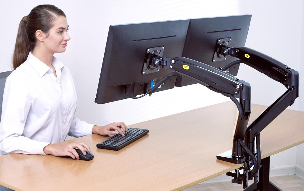 Dvojmonitorový stolný držiak NB F195AB Profesionálny stolný držiak na 2 monitory 19-37", 3D nezávislé nastavenie polohy, design, kvalita, ergonómia, VESA 75x75 a 100x100, nosnosť 18kg Špičkový profesionálny stolný držiak na zavesenie 2 monitorov a ich nezávislé nastavenie polohy: otáčanie do strán, nastavenie výšky, nastavenie vzdialenosti od stolového držiaku, náklon, rotácia obrazovky. korekcia roviny. Hmotnosť každého monitoru musí byť v rozmedzí 3-9kg. Balenie obsahuje 2 typy úchytov na stolovú dosku, inštalačný materiál a návod. Farebné prevedenie čierne. Záruka 3 roky. Stolný držiak na 2 monitory 19-37" do kancelárie alebo pracovne NB F195AB Technické údaje: celková nosnosť 18kg hmotnosť každého monitora musí byť v rozmedzí 3 ÷ 9 kg podpora VESA štandardu 75x75 a 100x100 v prípade potreby za príplatok možnosť rozšírenia VESA na 200x100 alebo 200x200 odporúčaná uhlopriečka monitorov 19" až 37" nezávislé nastavenie výšky: min. 220mm, max. 565mm nezávislé otáčanie monitoru do strán +/- 180° nezávislé naklonenie monitoru +53° až -8° nezávislá rotácia monitoru - otočenie monitora na šírku alebo na výšku, korekcia roviny nezávislé nastavenie vzdialenosti od stolového držiaka: 0mm až 700mm ukotvenie na stolové dosky o priemere 10mm až 90mm balenie obsahuje 2 typy úchytov na stolové dosky (svorky na okraj stolu + skrutkovanie do priestoru stola) 2x USB port vynikajúca kvalita, krásny design ľahké nastavenie polohy monitorov spoľahlivosť, bezpečnosť farebné prevedenie čierne, strieborné alebo biele záruka 3 roky Polohovateľný stolný držiak 2 monitorov do kancelárií a pracovní NB F195AB Dvojmonitorový stolný držiak podporuje VESA štandardy: VESA 75x75 VESA 100x100 za príplatok rozšírenie na VESA 200x100 za príplatok rozšírenie na VESA 200x200
