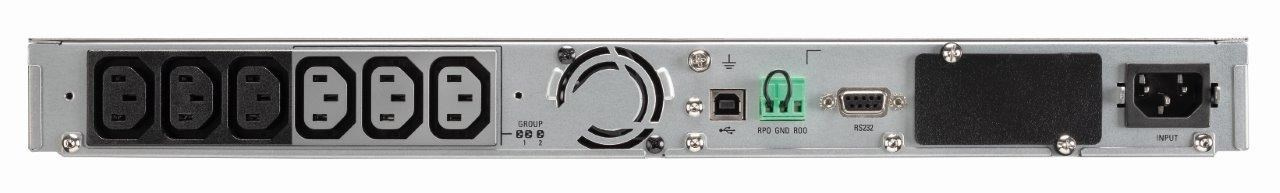 | Špeciálne funkcie | Automatická regulácia napätia (AVR) Ochrana s vysokou hustotou pre siete: len 1U Energetická účinnosť, zníženie nákladov na energiu a chladenie Poskytuje čistý sinusový výstup 1 slot pre voliteľnú komunikačnú kartu (karta pre správu siete, reléová karta alebo sieťová a priemyselná karta) Kompatibilné s virtuálnymi prostrediami (VMware, Hyper-V, Citrix Xen, Redhat) Plne sa integruje so softvérom Eaton Intelligent Power Manager 1 USB port + 1 sériový port Technológia Advanced Battery Management (ABM) pre predĺženie životnosti batérie Grafický LCD displej novej generácie Batérie vymeniteľné za prevádzky Vzdialený reštart a optimalizácia behu vďaka 2 spravovateľným skupinám zásuviek |