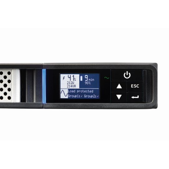 - Nový grafický LCD displej poskytuje na jednej obrazovke základné informácie o stave UPS a o meraných veličinách (v sedmi jazykoch podľa voľby). K dispozícii sú tiež rozšírené možnosti konfigurácie pomocou zrozumiteľných navigačných tlačidiel.