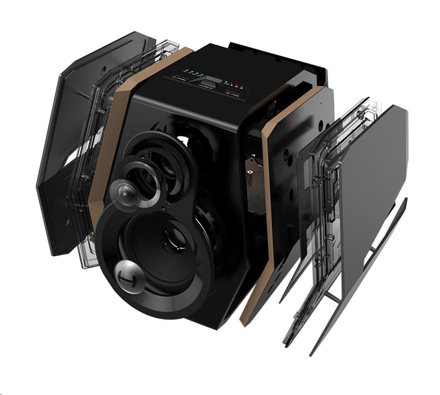 Spojením drevenej skrinky reproduktorov s hliníkovými bočnými panelmi umožnili dizajnéri zakomponovať špičkové osvetlenie RGB, čím vytvorili jedinečný vzhľad.