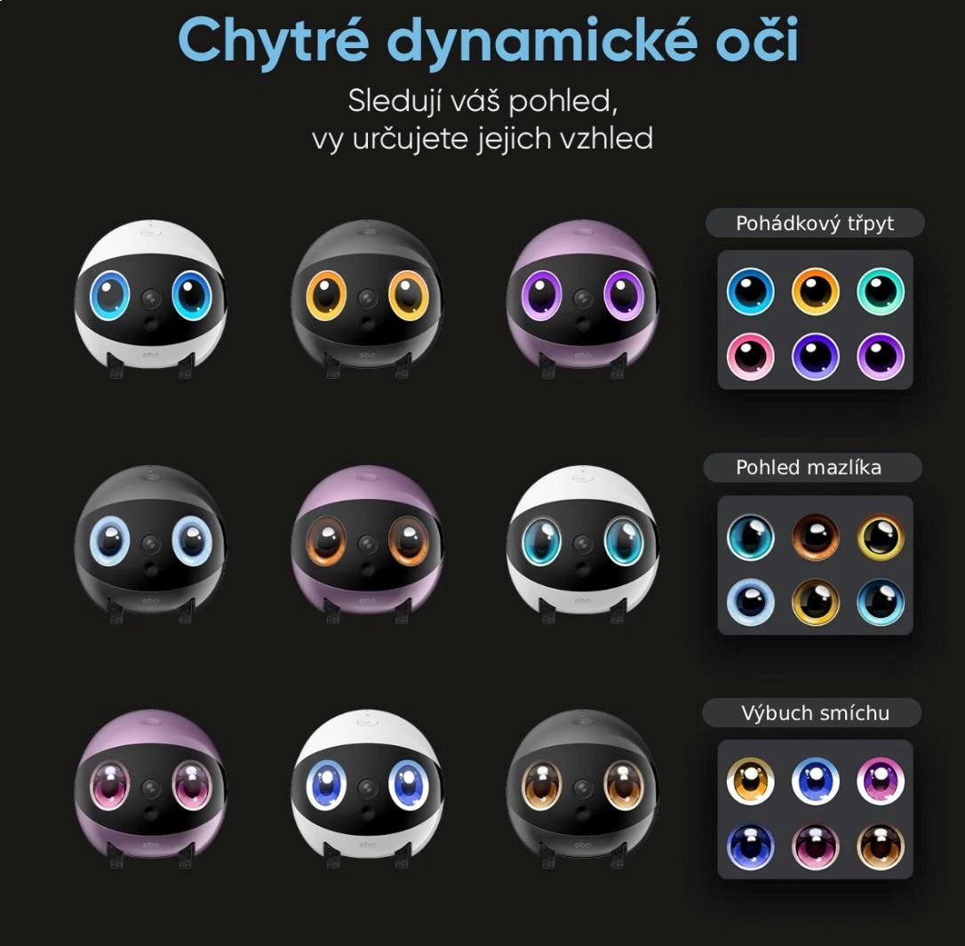 - Chytré dynamické oči – dva displeje s nastaviteľnými farbami a animáciami dodávajú robotovi osobnosť a priateľský vzhľad
