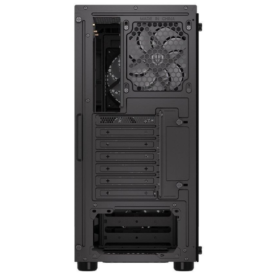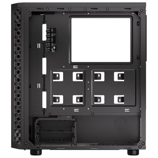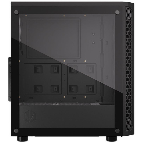 Skriňa formátu Middle Tower s priehľadnou bočnicou z tvrdeného skla ponúka dve 2,5" pozície pre SSD disky a dve 3,5" pozície pre pevné disky. Na hornom paneli sa nachádzajú dva USB 3.0 porty, slúchadlový výstup a audio vstup pre mikrofón. Je vybavená štyrmi 120 mm ventilátormi s ARGB podsvietením, ktoré spolu s perforovaným čelným panelom zabezpečujú dostatočné prúdenie vzduchu. Nápadité riešenie umožňuje pohodlné umiestnenie až 360 mm dlhého výmeníka vodného chladenia na prednej strane. Vo skrini je dostatok priestoru pre chladič CPU do výšky až 161 mm a grafickú kartu dlhú až 350 mm. Dodáva sa bez zdroja. Súčasťou je tiež sada prachových filtrov.