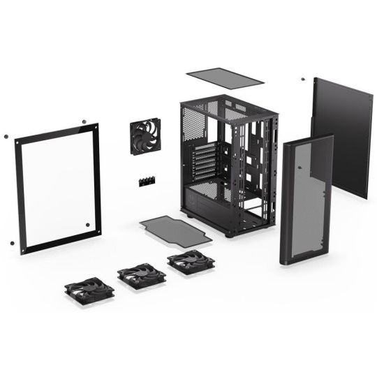 Skriňa formátu Middle Tower s priehľadnou bočnicou z tvrdeného skla ponúka dve 2,5" pozície pre SSD disky a jednu 3,5" pozíciu pre pevný disk. Na hornej časti sa nachádza dva USB 3.0 porty, výstup na slúchadlá a audio vstup pre mikrofón. Vybavená je štyrmi 120 mm ventilátormi, ktoré spolu s perforovaným čelným panelom zabezpečujú dostatočný prúd vzduchu. Dômyselné riešenie umožňuje pohodlné umiestnenie až 360 mm dlhého výmeníka vodného chladenia na prednej strane. Vo skrini je dostatok priestoru pre chladič CPU do výšky až 161 mm a grafickú kartu dĺžky až 315 mm. Dodávaná je bez zdroja. Súčasťou je tiež sada prachových filtrov.