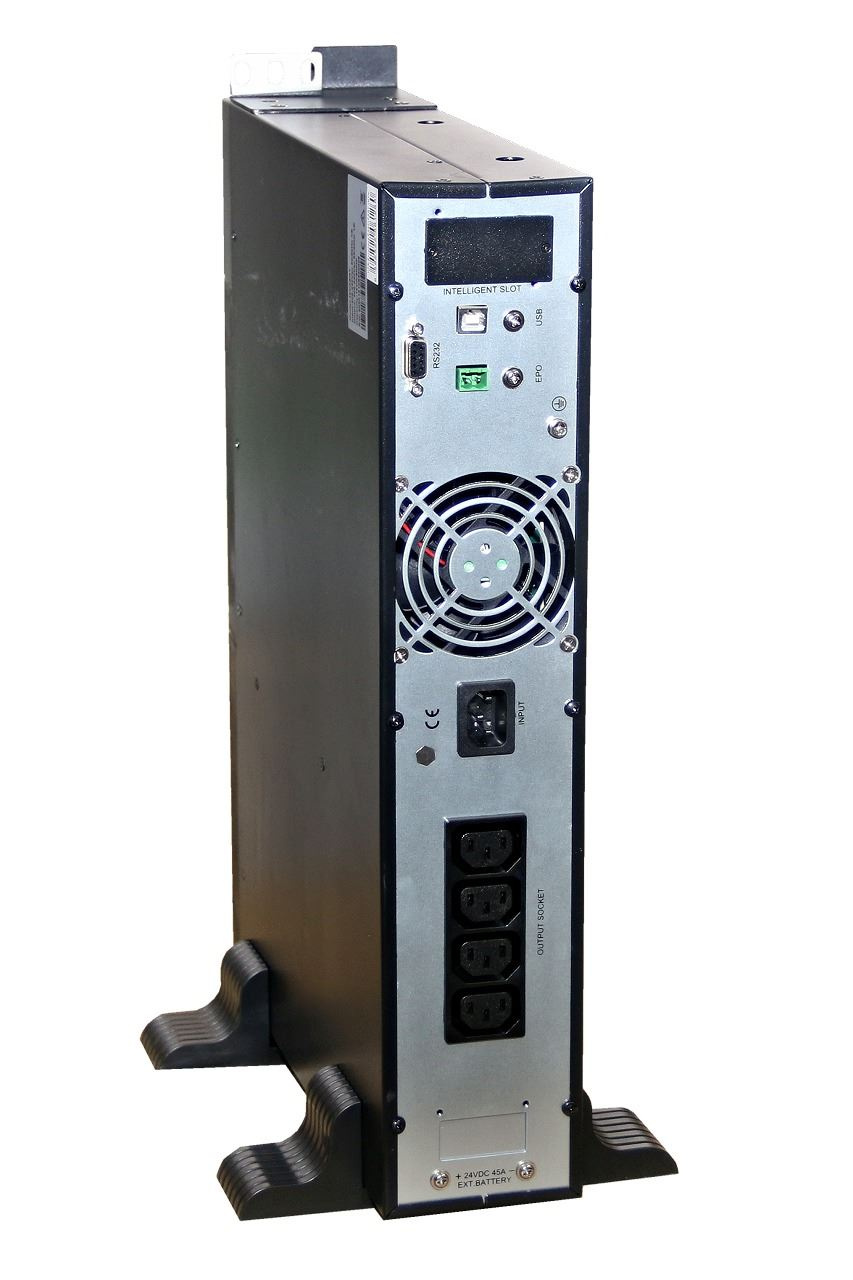 Online záložný zdroj EA901PRT so sínusovým výstupom. Rozmerovo navrhnutý pre serverové aplikácie (montáž do 19" racku). Súčasťou balenia sú plastové podstavce na vertikálne umiestnenie. 3 ovládacie tlačidlá a informačný displej na prednom paneli.