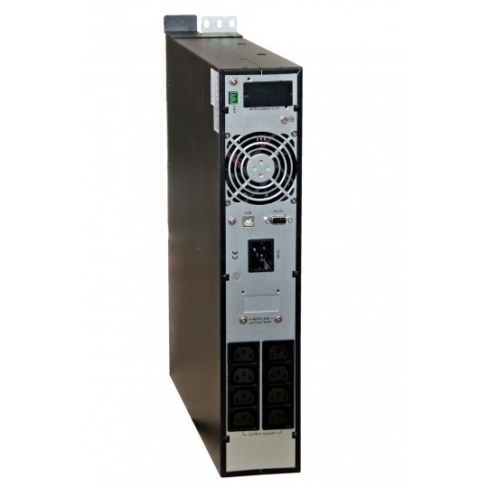 Online záložný zdroj EA902PRT so sínusovým výstupom. Rozmerovo navrhnutý pre serverové aplikácie (montáž do 19" racku). Súčasťou balenia sú plastové podstavce na vertikálne umiestnenie. 3 ovládacie tlačidlá a informačný displej na prednom paneli.