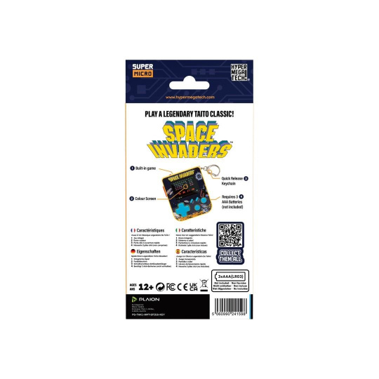 Retro hranie v mikro rozmeroch vďaka klúčence Super Micro Space Invaders Keychain Gamer od HyperMegaTech! Dostatočne malé na to, aby ste si ju mohli pripnúť k kľúčom a zobrať kamkoľvek, ale aj dostatočne veľké na to, aby ste si mohli zahrať. Obsahuje klasickú, oficiálne licencovanú hru Space Invaders! Dvoupalcová obrazovka RGB umožňuje maximálnu hrateľnosť a ovládanie hlasitosti na správnu mieru z nej robí viac než len cetku. Vyžaduje 3 batérie AAA (nie sú súčasťou balenia).