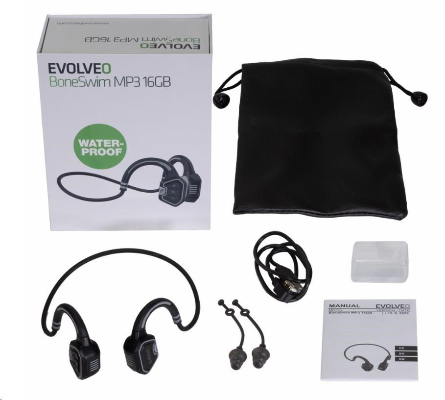| Obsah balenia | EVOLVEO BoneSwim MP3 slúchadlá Ochranný prenosný obal Magnetický napájací kábel Ucpávky do uší v krabičke + uchytenie Užívateľský manuál |