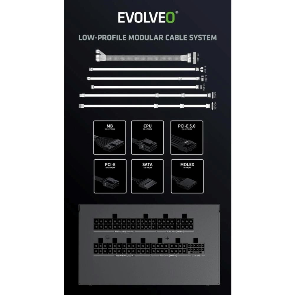 Zabudnite na zamotané káble, ktoré bránia prúdeniu vzduchu a ešte vášmu počítačovému skrinku kazia štýl. Zdroj EVOLVEO G850-BK je úplne modulárny, takže ku nemu pripojíte len tie káble, ktoré skutočne potrebujete. Súčasťou balenia sú všetky dôležité šnúry – jeden kábel ATX 24 PIN, dva EPS 4+4 PIN, dva PCI-E 6+2 PIN, jeden PCI-E 5.1 12V-2×6, tri SATA a jeden MOLEX. Vďaka tomu máte miesto na všetko od CPU a GPU cez disky až po vymazlené LED pásy či iné extra prvky.