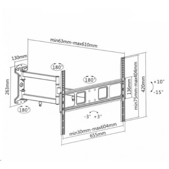 Technické údaje: maximálne zaťaženie 35kg podpora VESA štandardu 75x75 až 600x400 otáčanie do strán +90° až -90° náklon +10° až -15° nastaviteľná vzdialenosť od steny minimálna vzdialenosť od steny 63mm maximálna vzdialenosť od steny 610mm korekcia roviny +3° až -3° kvalitná konštrukcia jednoduchá montáž a nastaviteľnosť úchyty na káble farba čierna záruka 5 rokov Držiak Fiber Mounts AX798 podporuje VESA štandardy: VESA 75x75 VESA 100x100 VESA 200x100 a 100x200 VESA 200x200 VESA 300x200 a 200x300 VESA 300x300 VESA 400x200 a 200x400 VESA 400x300 a 300x400 VESA 400x400 VESA 500x300 VESA 500x400 VESA 600x400 •VESA 200x200 •VESA 300x200 •VESA 300x300 •VESA 400x200 •VESA 400x300 •VESA 400x400 •VESA 600x400