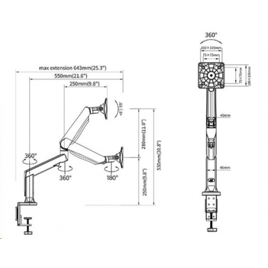 Profesionálny stolový plne polohovateľný držiak na monitory a televízory s uhlopriečkou 17-32" Ponúkame vám špičkový držiak na televízor alebo monitor s uchytením na stolovú dosku, ktorý je plne polohovateľný - otáčanie do strán, nastavenie náklonu, výšky a vzdialenosti od uchytenia, otáčanie obrazovky do horizontálnej alebo vertikálnej polohy. Držiak je ideálny na zavešenie všetkých typov televízorov a monitorov s uhlopriečkou 17-32" a hmotnosťou maximálne 8kg. Nastavenie výšky umožňuje plynová pružina, ktorú ľahko nastavíte na hmotnosť 2-8kg. Polohovanie obrazovky je veľmi jednoduché a príjemné, zvládnu to aj deti. Držiak má systém pre vedenie káblov a pripojenie USB portov. Farba čierna. Záruka 3 roky. Technické údaje: nosnosť 8kg minimálne zaťaženie 2kg držiak podporuje VESA štandardy 75x75 a 100x100 možnosť zakúpenia rozšírenia na VESA 200x100 alebo 200x200 ideálne na zavešenie monitorov a televízorov s uhlopriečkou 17-32" otáčanie do strán +/- 180° náklon + 55° až - 8° funkcia PIVOT - otáčanie obrazovky na dĺžku alebo na výšku (horizontálne alebo vertikálne) nastavenie vzdialenosti od uchytenia na stolovú dosku max. 643mm výškové polohovanie 280mm minimálna výška od stola 250mm maximálna výška od stola 530mm systém vedenia káblov 2x USB port 2 typy uchytenia na stolovú dosku (na okraj, do priestoru) uchytenie na stolovú dosku o sile 10-95mm profesionálna kvalita farba čierna záruka 3 roky
