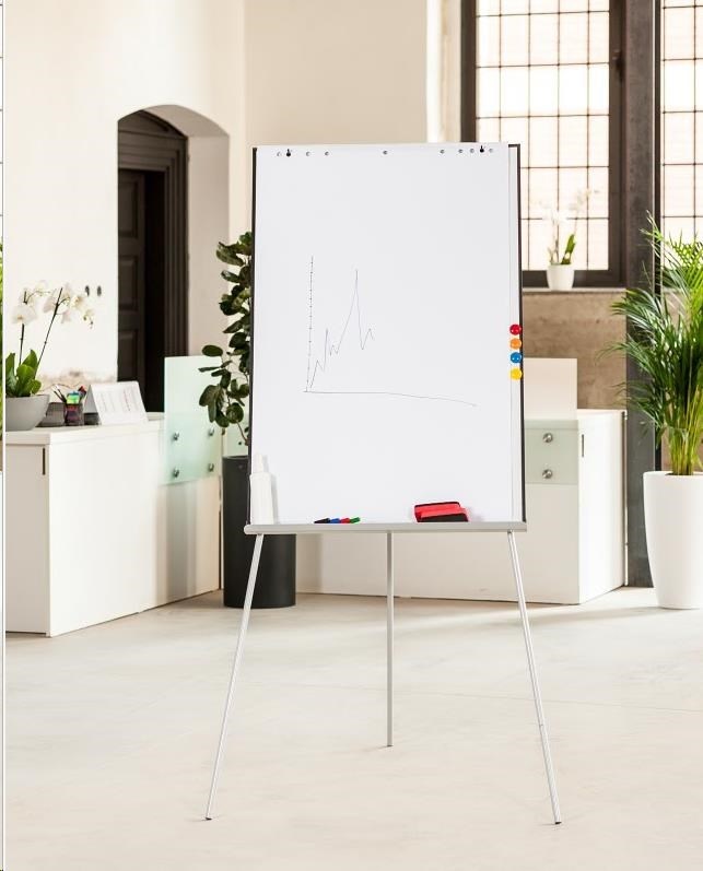 Flipchart s magnetickým povrchom. Flipchart má bočné flipové lišty na zavesenie potrebných materiálov...