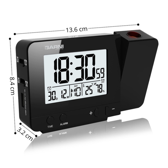 Digitálny budík s projekciou času a vnútornej teploty s LCD displejom, časom riadeným rádiovým signálom DCF-77 a meraním vnútornej teploty a relatívnej vlhkosti LCD displej o rozmere 63 x 42 mm s možnosťou stálého osvetlenia pri napájaní sieťovým adaptérom, alebo krátkodobým osvetlením na 8 s pri napájaní batériami 3 stupne jasu osvetlenia displeja, možnosť vypnutia osvetlenia displeja (pri napájaní sieťovým adaptérom) veľkosť číslic na displeji – čas 25 mm, dátum, skratka názvu dňa, vnútorná teplota a rel. vlhkosť 8,5 mm čas a dátum riadené signálom DCF-77 s možnosťou manuálneho nastavenia ikona príjmu signálu DCF-77 skratka názvu dňa 12-hodinový alebo 24-hodinový formát zobrazenia času možnosť nastavenia časového pásma od -12 do +12 hodín budík s 2 budícími časmi s funkciou opakovaného bdenia (Snooze) po 5 minútach budící signál - 10 sekúnd 1 pípnutie za sekundu, 10 sekúnd 2 pípnutia za sekundu, 10 sekúnd 4 pípnutia za sekundu a potom stály pípací zvuk projekcia času a vnútornej teploty s možnosťou otočenia obrazu o 180°, možnosť sklopenia tubusu projektora o 90° dopredu a dozadu farba projekcie červená stále projekcie pri napájaní sieťovým adaptérom s možnosťou vypnutia zobrazenie hodnôt vnútornej teploty a relatívnej vlhkosti zobrazenie teploty vo °C, alebo °F USB port na nabíjanie mobilných zariadení (len pri napájaní hlavnej jednotky sieťovým adaptérom), maximálny nabíjací prúd 1 000 mA napájanie sieťovým adaptérom, alebo batériami možnosť postavenia farba čierna Obsah balenia: 1 x digitálny budík GARNI 140 1 x sieťový adaptér český, slovenský, nemecký, anglický, taliansky, poľský a maďarský návod