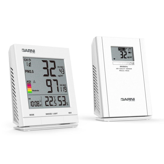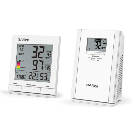 Merač kvality ovzdušia GARNI 204 OneCare je určený na vnútorné použitie. Meria a zobrazuje na svojom LCD displeji hodnoty kvality ovzdušia – koncentráciu pevných častíc PM2.5 a PM10 nameranú bezdrôtovým senzorom GARNI 104Q (jeden bezdrôtový senzor je súčasťou balenia) a tiež teplotu a relatívnu vlhkosť. Pre meranie pevných častíc (PM) je použité švajčiarske čidl? SENSIRION radu SPS ? meranie pevných častíc (PM) PM2.5 a PM10 bezdrôtovým senzorom GARNI 104Q ? hlavná jednotka meria teplotu a relatívnu vlhkosť a zobrazuje hodnoty pevných častíc PM2.5, alebo PM10 namerané bezdrôtovým senzorom GARNI 104Q ? pre meranie pevných častíc sú použité presné švajčiarske čidlá SENSIRION radu SPS ? jednotkou PM sú µg/m3 ? prehľadný LCD displej hlavnej jednotky o rozmere 69 x 64 mm ? veľkosť číslic na displeji – čas 6,5 mm, teplota, relatívna vlhkosť 12 mm, aktuálna hodnota PM2.5, PM10 17 mm, maximálna hodnota 7 mm, aktuálna hodnota AQI 17 mm, maximálna hodnota 7 mm ? zobrazenie aktuálnych hodnôt PM2.5, PM10 a AQI, alebo priemerných hodnôt nameraných za 24 hodín ? indikácia kvality ovzdušia farebnou stupnicou AQI (Air Quality Index) a číselnou hodnotou AQI ? pamäť na maximálnu hodnotu PM2.5, PM10 a AQI od posledného vymazania pamäti, za poslednú hodinu a posledných 24 hodín alarm AQI upozorní na vysokú úroveň AQI na základe aktuálne nameranej hodnoty AQI alebo priemernej hodnoty za posledných 24 hodín. Jakmile je dosiahnutá hodnota, ktorá bola nastavená, aktivuje sa zvukové znamenie a na displeji hlavnej jednotky začne blikať ikona alarmu ? možnosť použitia až 4 bezdrôtových senzorov GARNI 104Q ? pri použití viacerých bezdrôtových senzorov GARNI 104Q možnosť automatického prepínania kanálov ? ikona signálu bezdrôtových senzorov ? čas riadený rádiovým signálom DCF-77 s možnosťou manuálneho nastavenia ? ikona prijmu signálu DCF-77 ? 12 alebo 24-hodinový formát zobrazenia času ? časová zóna -23 až +23 hodín ? zobrazenie teploty vo °C alebo °F ? automatické prepínanie letného a zimného času ? aktualizácia nameraných hodnôt – 60 sekúnd ? budík s funkciou Snooze (posunutie buzenia o 5 minút) ? možnosť krátkodobého osvetlenia displeja na 9 sekúnd ? ikona slabých batérií ? napájanie na batérie Bezdrôtové čidlo GARNI 104Q ? na vnútorné použitie ? displej o rozmere 37 x 21 mm ? veľkosť číslic 10 mm ? zobrazenie hodnoty kvality ovzdušia PM2.5 alebo PM10 ? 4 kanály ? zobrazenie čísla kanála, ikony slabých batérií, ikony vysielania a nabíjania na displeji ? vizualizácia kvality ovzdušia hodnotou koncentrácie na šestirúkovej stupnici ? aktualizácia a prenos nameranej hodnoty kvality ovzdušia pri napájaní USB adaptérom každých 60 sekúnd ? pri napájaní batériami meria bezdrôtové čidlo GARNI 104Q vo východiskovom nastavení koncentráciu PM2.5 a PM10 automaticky každých 10 minút. Pre maximalizáciu výdrže batérií je možné zmeniť interval merania z 10 minút na 20 alebo 30 minút ? dosah signálu až 100 m vo voľnom priestore ? frekvencia prenosu 868 MHz ? napájanie 3 x 1.2V NiMH nabíjacie batérie typu AA, alebo cez USB adaptér (adaptér nie je súčasťou balenia), nabíjanie cez USB (5V/1A) Obsah balenia 1 x hlavná jednotka 1 x bezdrôtové čidlo GARNI 104Q 3 ks nabíjacích batérií typ AA, 1,2 V, Ni-MH, 2000 mAh 1 x USB kábel 120 cm CZ, SK, EN návod, QR kód s odkazom na stiahnutie návodov DE, NL, PL, HU