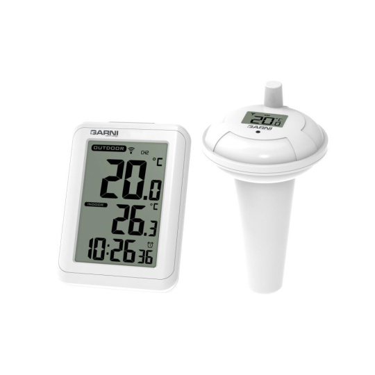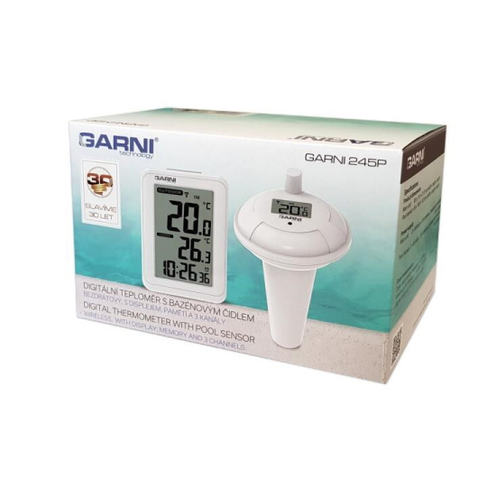 Digitálny teplomer s bazénovým čidlom GARNI 245P na meranie teploty vody zobrazuje tiež teplotu na mieste hlavnej jednotky a čas. Bezdrôtové bazénové čidlo GARNI 065P je kompatibilné s meteorologickými stanicami GARNI 612 Precise, GARNI 615W Precise, GARNI 615B Precise, GARNI 618W Precise a GARNI 618B Precise.