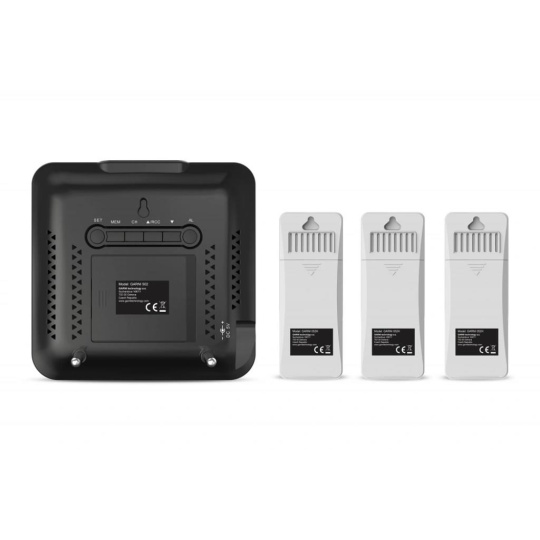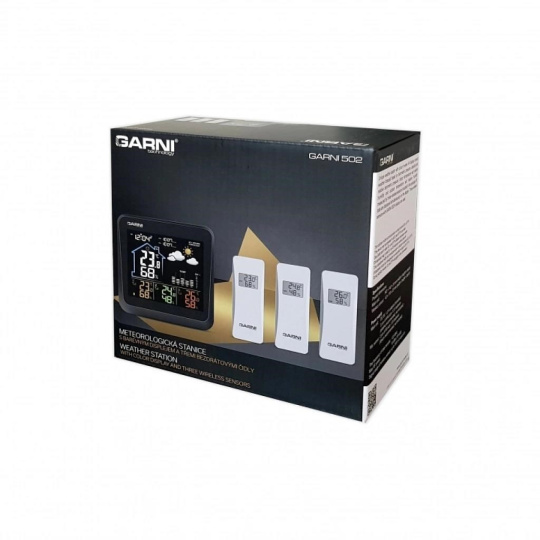 Meteorologická stanica s 3 bezdrôtovými snímačmi na meranie vonkajšej teploty a relatívnej vlhkosti, špičkovým inverzným farebným VA displejom s časom a dátumom riadeným rádiovým signálom DCF-77, budíkom, grafom, meraním vnútornej teploty, relatívnej vlhkosti a absolútneho a relatívneho barometrického tlaku. Zobrazenie všetkých meraných hodnôt na displeji súčasne. špičkový inverzný farebný VA displej o rozmeroch 106 x 94 mm s možnosťou stályho osvetlenia pri napájaní sieťovým adaptér, alebo krátkodobým osvetlením na 10 s pri napájaní batériami tri stupne jasu osvetlenia displeja (pri napájaní sieťovým adaptér) a možnosť vypnutia osvetlenia displeja veľkosť číslic na displeji – čas, dátum 7 mm, vnútorná teplota 21 mm, vnútorná relatívna vlhkosť 14 mm, vonkajšia teplota 12,5 mm, vonkajšia relatívna vlhkosť 10 mm, barometrický tlak 4,5 mm farbenie na displeji: čas, barometrický tlak, vnútorná teplota a rel. vlhkosť, graf biela, teplota a rel. vlhkosť na kanáli č.1 žltá, na kanáli č.2 zelená a na kanáli č.3 oranžová čas a dátum riadené signálom DCF-77 s možnosťou manuálneho nastavenia ikona príjmu signálu DCF-77 12-hodinový alebo 24-hodinový formát zobrazenia času možnosť nastavenia časového pásma od -12 do +12 hodín budík s funkciou opakovaného budenia (Snooze) po 5 minútach budící signál - 10 sekúnd 1 pípnutie za sekundu, 10 sekúnd 2 pípnutia za sekundu, 10 sekúnd 4 pípnutia za sekundu a následne stály pípajúci zvuk 5 ikon predpovede počasia (jasno, polojasno, oblačno, zrážky (dážď), zrážky (sneženie) na základe sledovania barometrického tlaku vestaveným barometrom možnosť nastavenia východiskovej ikony predpovede počasia zobrazenie hodnôt vnútorného a vonkajšieho tepla a relatívnej vlhkosti zo všetkých 3 snímačov súčasne zobrazenie teploty vo °C alebo °F zobrazenie barometrického tlaku absolutného a relatívneho (hPa/mb alebo mmHg) možnosť nastavenia hodnoty relatívneho barometrického tlaku graf vývoja bar. tlaku, vnútorné a vonkajšie teploty na všetkých troch kanáloch za uplynulých 12 hodín pamäť na maximálne a minimálne namerané hodnoty teploty a relatívnej vlhkosti 3 ikony vnútorného tepelného pohodlia 3 bezdrôtové snímače GARNI 052H sú súčasťou balenia bezdrôtový prenos hodnôt vonkajšej teploty a relatívnej vlhkosti na frekvencii 433 MHz ikona slabých batérií hlavnej jednotky a vonkajších snímačov napájanie hlavnej jednotky sieťovým adaptérom alebo batériami dĺžka kábla sieťového adaptéra 1,80 m možnosť postaviť, alebo zavesiť farba čierna Bezdrôtové snímač GARNI 052H odolné voči vlhkosti displej o rozmeroch 25 x 12 mm veľkosť číslic na displeji: teplota 7 mm a relatívna vlhkosť 6 mm meranie teploty a relatívnej vlhkosti 3 kanály maximálny RF výkon 10 dBm (10 mW) možnosť postaviť, alebo zavesiť farba biela Obsah balenia: 1 x hlavná jednotka GARNI 502 3 x bezdrôtové snímače GARNI 052H 1 x sieťový adaptér český, slovenský, nemecký, anglický, poľský, maďarský a holandský návod