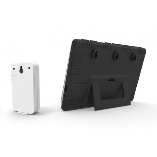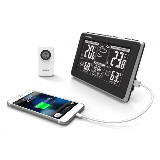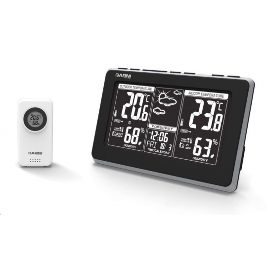 Meteorologická stanica s inverzným LCD displejom s časovo riadeným rádiovým signálom DCF-77, budíkom, meraním vnútornej teploty a relatívnej vlhkosti, bezdrôtovým čidlom na meranie vonkajšej teploty a relatívnej vlhkosti a USB portom na napájanie externých zariadení. Mobilný telefón a USB kábel nie sú súčasťou balenia - inverzný LCD displej o rozmeroch 169 x 94 mm s možnosťou stályho osvetlenia pri napájaní sieťovým adaptérom, alebo krátkodobým osvetlením na 8 s pri napájaní batériami - dva stupne jasu osvetlenia displeja, možnosť vypnutia osvetlenia displeja (pri napájaní sieťovým adaptérom) - pri napájaní len batériami možno rozsvietiť displej zvukom, napr. klepnutím, tlesknutím a pod. - veľkosť číslic na displeji – čas 12,5 mm, dátum a skratka názvu dňa 8 mm, vnútorná a vonkajšia teplota 38 mm, vnútorná a vonkajšia relatívna vlhkosť 23 mm - čas riadený signálom DCF-77 s možnosťou manuálneho nastavenia - ikona príjmu signálu DCF-77 - 12-hodinový alebo 24-hodinový formát zobrazenia času - možnosť nastavenia časového pásma od -12 do +12 hodín - budík s 2 budícími časmi s funkciou opakovaného budenia (Snooze) nastaviteľného od 3 do 20 minút - budící signál - 10 sekúnd 1 pípnutie za sekundu, 10 sekúnd 2 pípnutia za sekundu a následne stály 4 pípnutia za sekundu - 13 ikon predpovede počasia v 6 úrovniach (jasno, polojasno, oblačno, dážď, búrky a sneženie) na základe sledovania barometrického tlaku vestaveným barometrickým čidlo - zobrazenie hodnôt vnútorné a vonkajšej teploty a relatívnej vlhkosti - šípky tendencie vývoja vnútornej a vonkajšej teploty - možnosť nastavenia alarmu horná a spodná hranica vnútorné a vonkajšej teploty (akustickým signálom a ikonou na displeji) - zobrazenie teploty vo °C alebo °F - možnosť použitia až 3 bezdrôtových čidiel GARNI 040H (jedno je súčasťou balenia) - funkcia automatického prepínania kanálov - bezdrôtový prenos hodnôt vonkajšej teploty a relatívnej vlhkosti na frekvencii 433 MHz - ikona príjmu signálu bezdrôtového čidla - USB port na nabíjanie mobilných zariadení (len pri napájaní hlavnej jednotky sieťovým adaptérom), maximálny nabíjací prúd 1 000 mA - napájanie sieťovým adaptérom alebo batériami - možnosť postavenia alebo zavešenia - farba čierna s striebornou Bezdrôtové čidlo GARNI 040H - odolné voči vlhkosti, krytie IP44 (odolné proti strekajúcej vode) - kruhový displej o priemere 19 mm - veľkosť číslic na displeji: teplota a relatívna vlhkosť 5 mm - meranie teploty a relatívnej vlhkosti - 3 kanály - maximálny RF výkon 10 dBm (10 mW) - možnosť postavenia a zavešenia - farba biela Obsah balenia: 1 x hlavná jednotka GARNI 560 EASY II 1 x bezdrôtové čidlo GARNI 040H 1 x sieťový adaptér český, slovenský, nemecký, anglický, poľský a maďarský návod