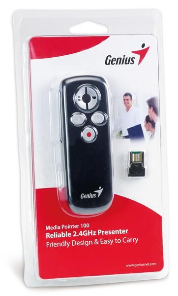 Úplne nový Media Pointer 100 od spoločnosti Genius je dokonalým nástrojom na používanie pri prezentáciách. Pokročilá bezdrôtová technológia 2,4 GHz poskytuje prevádzkový dosah až 10 metrov bez rušenia. Je to užitočný nástroj na stretnutia, prejavy alebo školenia na cestách.