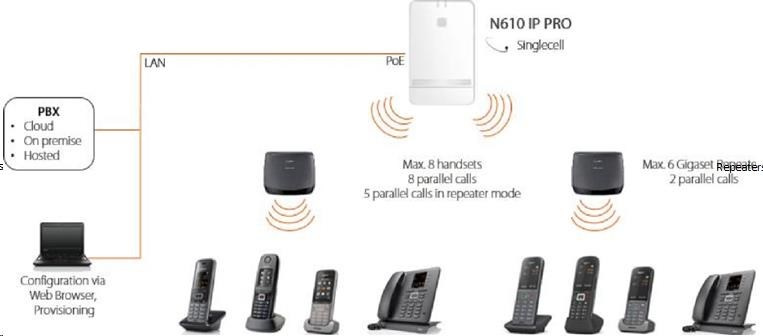 Gigaset N610 PRO The professional IP DECT base singlecell system for mobile communication in small companies The Gigaset N610 IP PRO is the choice for cordless telephony convenience for up to 8 users. Up to 8 parallel calls guarantee a high degree of readiness in your business environment. Calls are secure due to SRTP ... viac