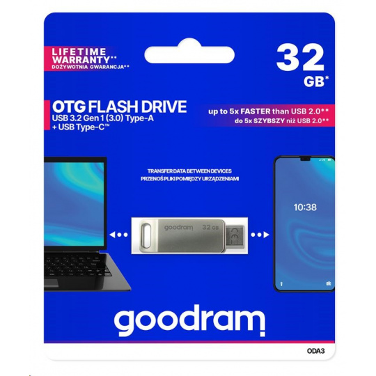 Type-C™ is becoming the most popular USB type used to transfer data between all electronic devices. The growing popularity of this solution is supported by the fact that manufacturers of next gen laptops, smartphones, PCs and other devices are increasingly equipping their products with an additional “C” next to the standard type A connector or choose only Type-C™. GOODRAM OTG ODA is an excellent solution that will work both with an old and new electronic devices generation laptops, smartphones and PCs. The ODA Flash drive is equipped with two fast USB 3.2 connectors: one standard type A and the Type-C™, which means that data transfer between devices of different generations has never been so easy and fast.