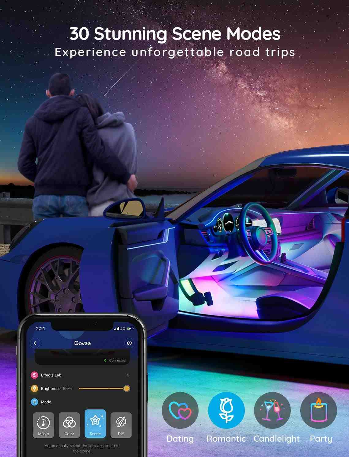Energeticky úsporný interiér inteligentné LED pásiky Govee Smart RGBIC pre autá so životnosťou až 50 000 hodín vylepšia interiér vášho auta a poskytnú zážitok, ktorý sa vyskytuje v luxusných autách. Môžete ich použiť prakticky kdekoľvek, kde je zapaľovanie. Zobrazuje až 16 miliónov farieb, ktorých intenzitu je možné nastaviť od 1 do 100 %. Vďaka technológii RGBIC môžete pásik rozdeliť na samostatné segmenty, pre ktoré si potom môžete vybrať rôzne farby. Vyberte si z 30 režimov svietenia a svetlá sa synchronizujú pri počúvaní obľúbenej hudby. Alebo si jednoducho nastavte vlastné farebné kombinácie v režime DIY. Príkazy môžete zadávať prostredníctvom aplikácie Govee Home na svojom smartfóne alebo tablete alebo priamo na Control Boxe. Inštalácia je jednoduchá a je rozdelená na prednú a zadnú časť vozidla.