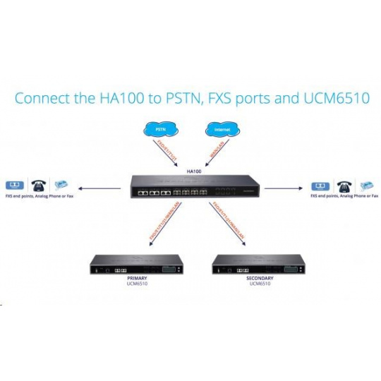 Grandstream HA100 je automatické riešenie failover pre ústredne Grandstream UCM6510. Keď sú pripojené dva UCM6510, HA100 začne neustále monitorovať stav oboch UCM6510 a v prípade poruchy sa celý systém automaticky prepne z nefunkčnej ústredne na funkčnú. Tento prepínač sa presúva vrátane pripojených telefónnych liniek, sieťových liniek, pomocných zariadení a všetkých účtov SIP uložených v predchádzajúcom primárnom UCM6510. Presun nastavení a spustenie druhej pobočkovej ústredne do prevádzkového režimu trvá od 10 do 50 sekúnd, pričom čas závisí od počtu registrovaných účtov SIP. S týmto zariadením získajú nároční zákazníci inteligentné monitorovacie a bezporuchové riešenie, ktoré zaručuje bezproblémovú prevádzku. Vlastnosti: Pripojenie a nepretržité monitorovanie dvoch UCM6510 pre nepretržitú dostupnosť Automatické prepnutie do pohotovostného režimu druhého UCM6510 v prípade poruchy primárneho až 14 LED indikátorov zobrazujúcich stav v reálnom čase Rýchle obnovenie v prípade poruchy, prepínanie medzi panelmi za 10 až 50 sekúnd..