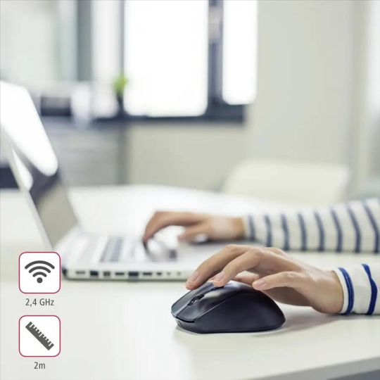 - robustná optická bezdrôtová myš špeciálne pre ľavákov - tlačidlá vpred/späť pre ovládanie internetového prehliadača - tlačidlo on/off pre dlhšiu životnosť batérií - nastaviteľné rozlíšenie (max. 1600 dpi) pre prispôsobenie rýchlosti myši - miniatúrny USB prijímač je možné pohodlne prenášať v tele myši alebo trvale zapojený v notebooku - 2,4 GHz bezdrôtová technológia pre spoľahlivý, rýchly a nerušený prenos signálu s dosahom do 8 metrov  Systémové požiadavky: - operačný systém: Windows 10/8/7/Vista  Technické parametre: - pripojenie: USB-A zásuvka - počet tlačidiel: 5 (vrátane rolovacieho kolieska) - rozmery: 7,4 x 10,9 x 3,9 cm - rozlíšenie: 800/1200/1600 dpi  Obsah balenia: - bezdrôtová myš - USB prijímač - 2 AAA batérie - návod na použitie.
