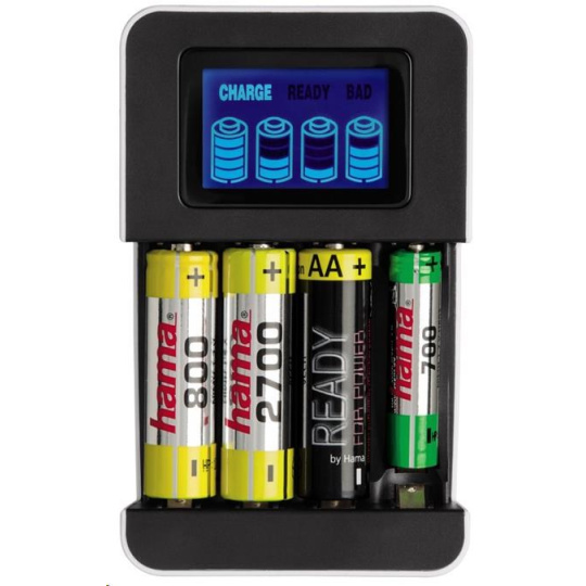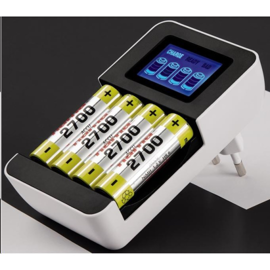 - zásuvková nabíjačka pre 1-4 NiMH akumulátory AA (mignon) alebo AAA (micro) - 4 individuálne nabíjacie sloty, každý akumulátor je monitorovaný a nabíjaný samostatne (možnosť nabíjania akumulátorov rôzneho typu a kapacity súčasne) - LCD displej s grafickým zobrazením priebehu nabíjania  - nabíjanie riadené mikroprocesorom (ochrana proti prebitiu a prehriatiu akumulátorov) - automatické ukončenie nabíjania pomocou detekcie Delta-U - bezpečnostná časová poistka - detekcia vadných akumulátorov - ochrana proti nesprávnej polarite  Technické parametre: - typ nabíjačky: automatická - konštrukcia nabíjačky: zásuvková (integrovaná sieťová vidlica) - typ akumulátorov: NiMH, veľkosť AA (R6) mignon/AAA (R03) micro - nabíjací prúd: 450 mA (AA)/200 mA (AAA) - napájanie: 100-240 V/50 Hz - farba: čierna/biela