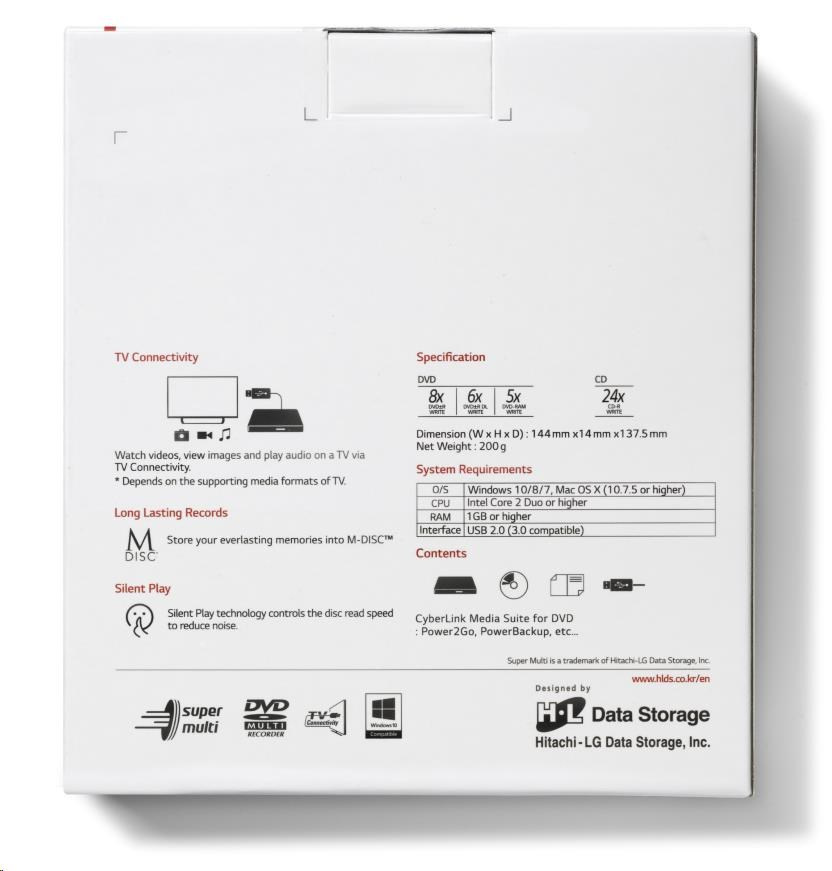 HITACHI LG - externá mechanika DVD-W/CD-RW/DVD±R/±RW/RAM GP60NW60, Slim, biela, krabica+SW