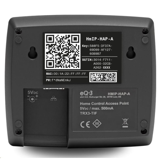Centrálnu jednotku (HmIP-HAP-A) je pripojená k štandardnému routeru ethernetovým káblom (RJ-45) a slúži ako rozhranie medzi cloudom Homematic IP umiestneným výlučne na serveroch v Nemecku a zariadeniami Homematic IP vo vašej domácnosti.