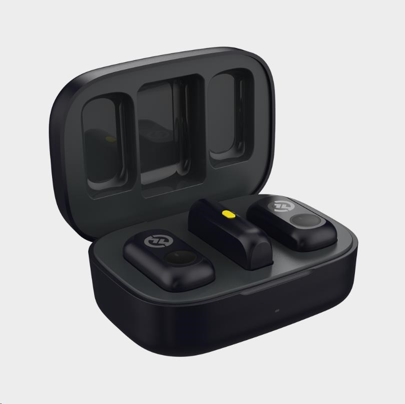 Výdrž batérie je vynikajúca: každý vysielač vydrží až 9 hodín na plné nabitie a priložené kompaktné nabíjacie puzdro poskytuje až dva úplné nabitia – celkovo tak máte približne 27 hodín používania. Systém sa nastaví automaticky – stačí pripojiť prijímač a začať nahrávať alebo vysielať naživo bez potreby aplikácií alebo zložitých ponúk.