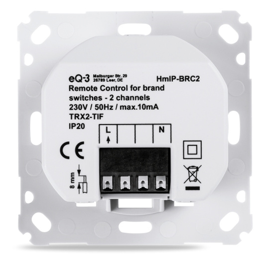 Akčný člen dálkového ovládania (HmIP-BRC2) sa montuje do štandardnej zápustnej krabice pod omietku s pripojením do siete 230 V. Bezdrôtová komunikácia ponúka možnosť inštalácie bez potreby dodatočného kabelážneho vedenia. To znamená, že akčný člen možno umiestniť na mieste pripraveného alebo existujúceho elektrického rozvodu siete 230 V. Napájanie len zo siete 230 V.