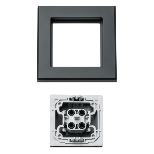 Kryt kolébkového vypínača so symbolmi šípok a rámečkom v antracitovej farbe (HmIP-BRA-A) pre programovateľné bezdrôtové akčné členy (HmIP-BRC2, HmIP-BROLL, HmIP-BBL, HmIP-BSM, HmIP-BDT) o veľkosti 55 mm je súčasťou systému inteligentnej domácnosti Homematic IP.