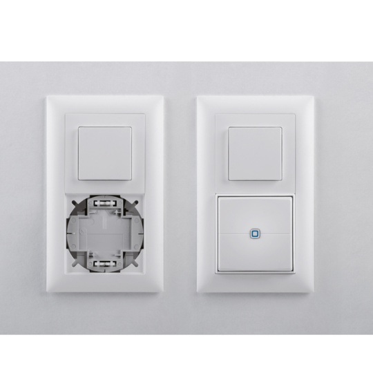 Jednoduchá integrácia batériových nástenných diaľkových ovládačov Homematic IP s rámikmi o veľkosti 55 mm modelovej rady Ediziodue od výrobcu Feller. Nevhodné pre akčné členy tretích strán.