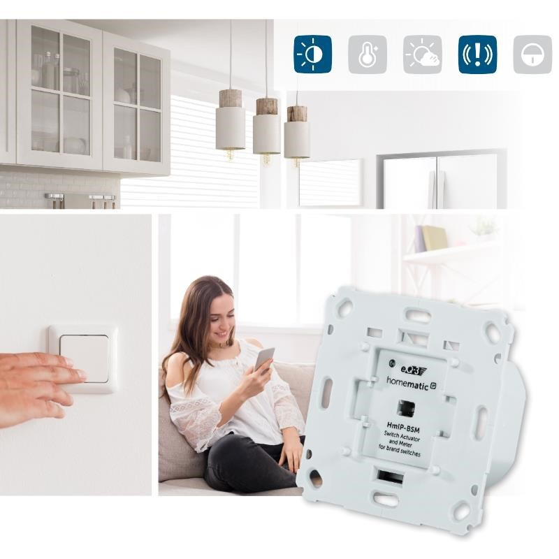 Programovateľný bezdrôtový Spínací akčný člen s meraním (HmIP-BSM) pre zápustnú montáž, napájaný zo siete 230 V, je súčasťou systému chytré domácnosti Homematic IP.