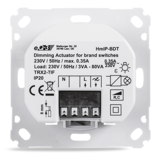 Stmievací akčný člen (HmIP-BDT) sa montuje do štandardnej zápustnej krabice pod omietku s pripojením do siete 230 V. Bezdrôtová komunikácia ponúka možnosť inštalácie bez potreby druhej kabeláže. To znamená, že akčný člen je možné umiestniť na mieste pripraveného alebo existujúceho elektrického rozvodu siete 230 V.