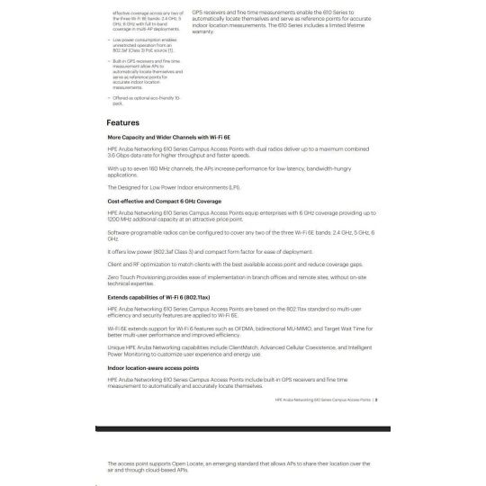 | Wi-Fi Optimization Client Optimization Aruba's patented AI-powered technology eliminates sticky client issues by steering a client to the AP where it receives the best radio signal. ClientMatch steers traffic from the noisy 2.4 GHz band to the preferred 5 GHz or 6 GHz band depending on client capabilities and AP setttings. ClientMatch also dynamically steers traffic to load balance APs to improve the user experience. Automated Wi-Fi Radio Frequency Management To optimize the user experience and provide greater stability, Aruba AirMatch allows organizations to automate network optimization using machine learning. AirMatch provides dynamic bandwidth adjustments to support changing device density, enhanced roaming using an even distribution of Effective Isotropic Radiated Power (EIRP) to radios, and real-time channel assignments to mitigate co-channel interference. AirMatch also ensures that the two radios of Aruba 610 Series Access Points are automatically configured in the most effective and efficient way to deliver full tri-band coverage. Application Assurance With Aruba Air Slice, organizations can provide application assurance to their users that goes beyond the traditional capabilities of airtime fairness. After the SLAs are configured, Air Slice monitors network usage, automatically allocates radio resources, and dynamically adjusts radio resources as new users connect and applications sessions begin or end. Aruba Advanced Cellular Coexistence (ACC) Unique to Aruba, Advanced Cellular Coexistence uses built-in filtering to automatically minimize the impact of interference from cellular networks, distributed antenna systems (DAS), and commercial small cell or femtocell equipment. Intelligent Power Monitoring (IPM) For better insights into energy consumption, Aruba APs continuously monitor and report hardware energy usage. Unlike other vendor's access points, Aruba APs can also be configured to enable or disable capabilities based on available PoE power - ideal when wired switches have exhausted their power budget. Enterprises can deploy Wi-Fi 6E APs and update switching and power at a later if needed based on their actual usage. Self-Locating APs Indoor location shouldn't require guesswork or costly overlay technologies. Aruba's Wi-Fi 6 and 6E APs help organizations leverage their wireless investment to deliver indoor location - everywhere. Aruba 610 Series Campus APs include built-in GPS receivers and intelligent software to allow them to automatically locate themselves accurately within the universal framework of latitude and longitude. As part of Aruba's indoor location services solution, they serve as reference points for client devices using fine time measurements (802.11mc) and other location technologies. In addition, Aruba's Wi-Fi 6 and 6E APs support Open Locate, an emerging standard that allows APs to share their location over the air and through cloud-based APIs, enabling mobile devices to locate themselves and applications to support network analytics. APs as an IoT transport platform The Aruba 610 Series includes an integrated Bluetooth 5 and 802.15.4 radio for Zigbee support to simplify deploying and managing IoT-based location services, asset tracking services, security solutions, and IoT sensors. There is also a USB-port extension to provide IoT connectivity to a wider range of devices. These IoT capabilities allows organizations to leverage Aruba APs as an IoT transport platform, which eliminates the need for an overlay infrastructure and additional IT resources and can accelerate IoT initiatives. In addition, Target Wake Time (TWT), part of the 802.11ax standard, establishes a schedule for when clients need to communicate with an AP. This helps improve client power savings and reduces airtime contention with other clients, which is ideal for IoT. Aruba secure infrastructure The Aruba 610 Series includes build-security capabilities such as: