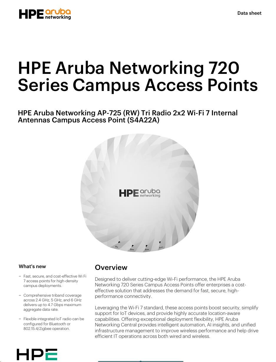 As part of a full portfolio of Wi-Fi 7 access points, the HPE Aruba Networking 720 Series Campus Access Points offer a cost-effective way to deliver fast, resilient, and secure Wi-Fi 7 wireless access across campus networks. Supported by HPE Aruba Networking Central, they help deliver an AI-powered, security-first network.