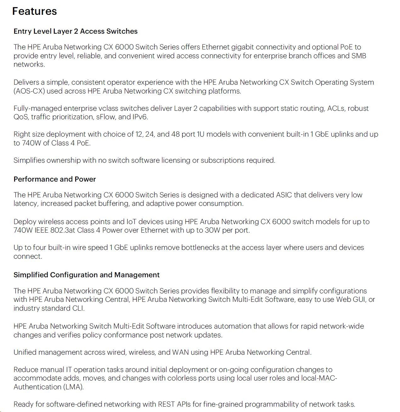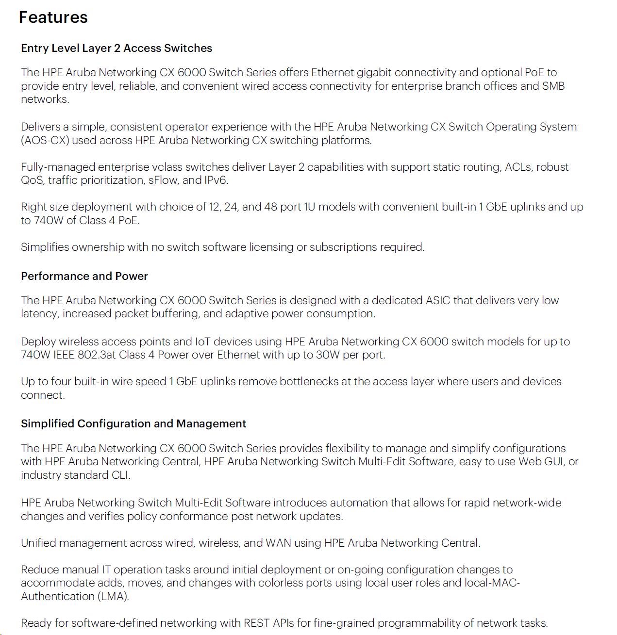 Aruba 6000 48G Class4 PoE 4SFP 370W Switch (R8N85A) | Aruba 6000 48G 4SFP Switch (R8N86A) | Aruba 6000 24G Class4 PoE 4SFP 370W Switch (R8N87A) | |