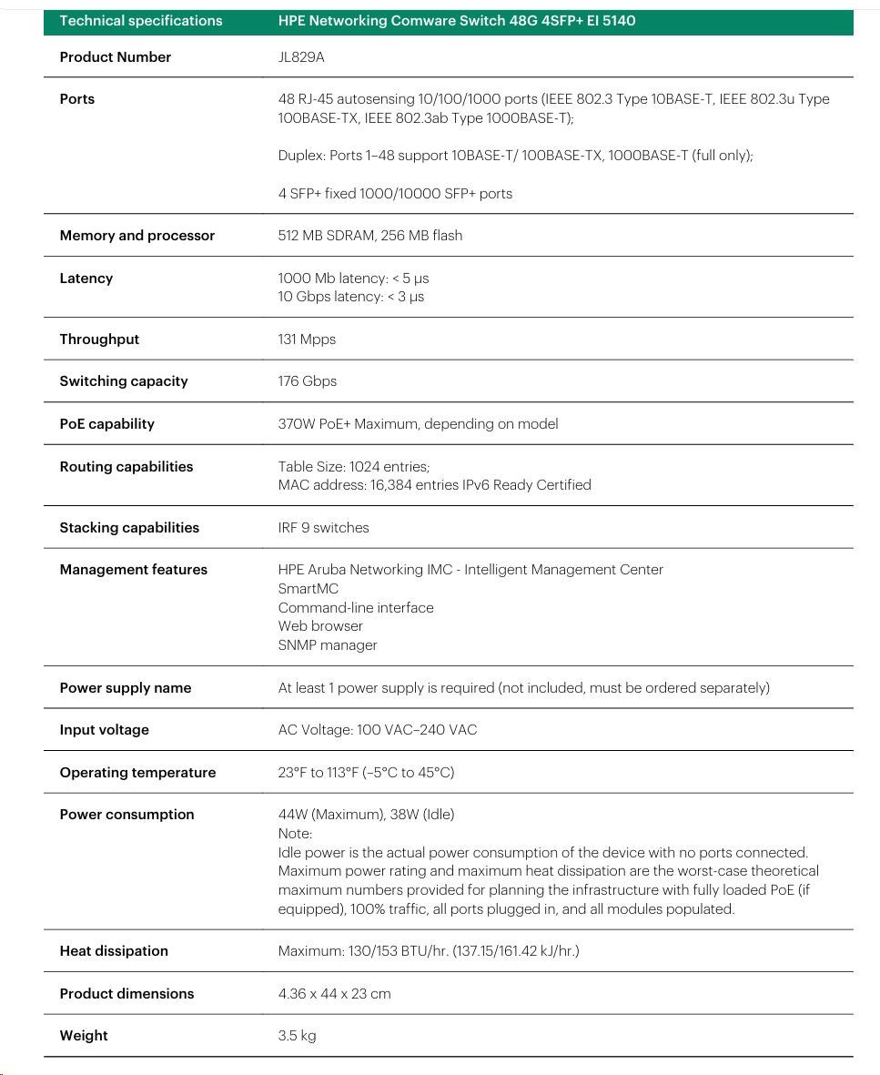 | Management | IMC - Intelligent Management Center; SmartMC; command-line interface; Web browser; SNMP Manager | |
