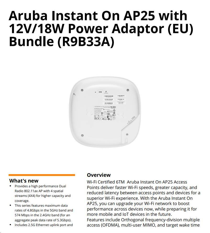 HPE Networking Instant On AP27 (EU) Dual Radio 2x2 Wi-Fi 6 Outdoor AP Bundle with PS (Includes 30W PoE midspan injector with EU Power Cord)